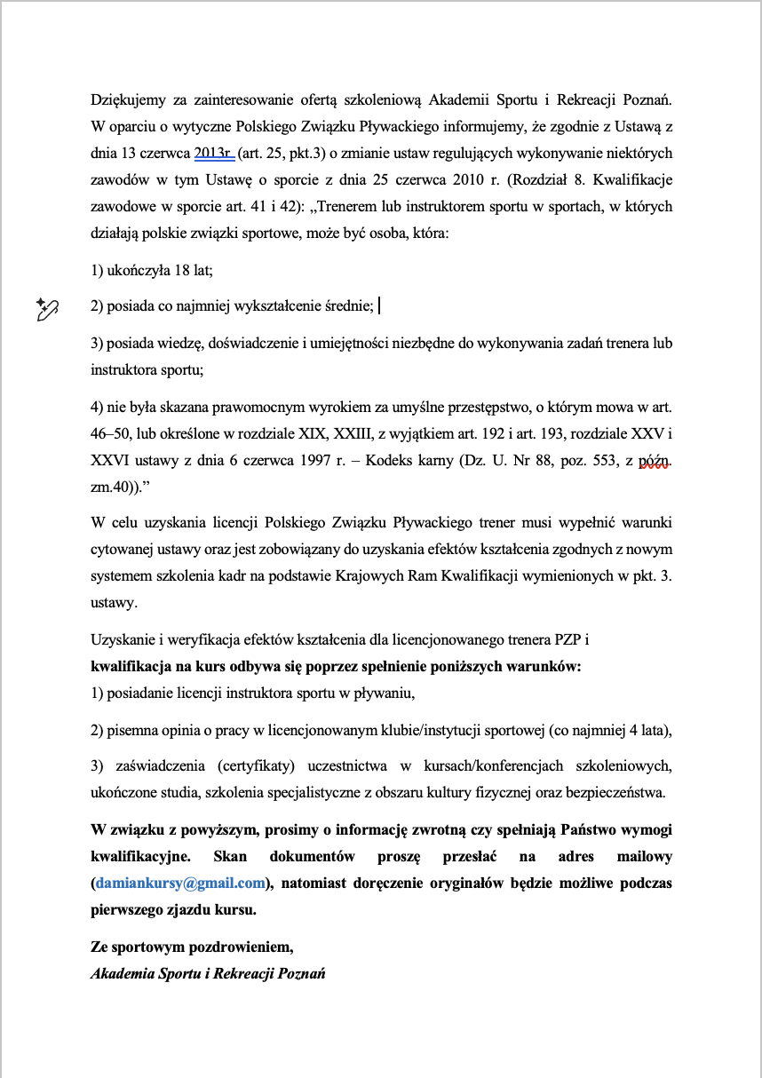 - posiada wiedzę, doświadczenie i umiejętności niezbędne do wykonywania zadań trenera lub instruktora sportu;